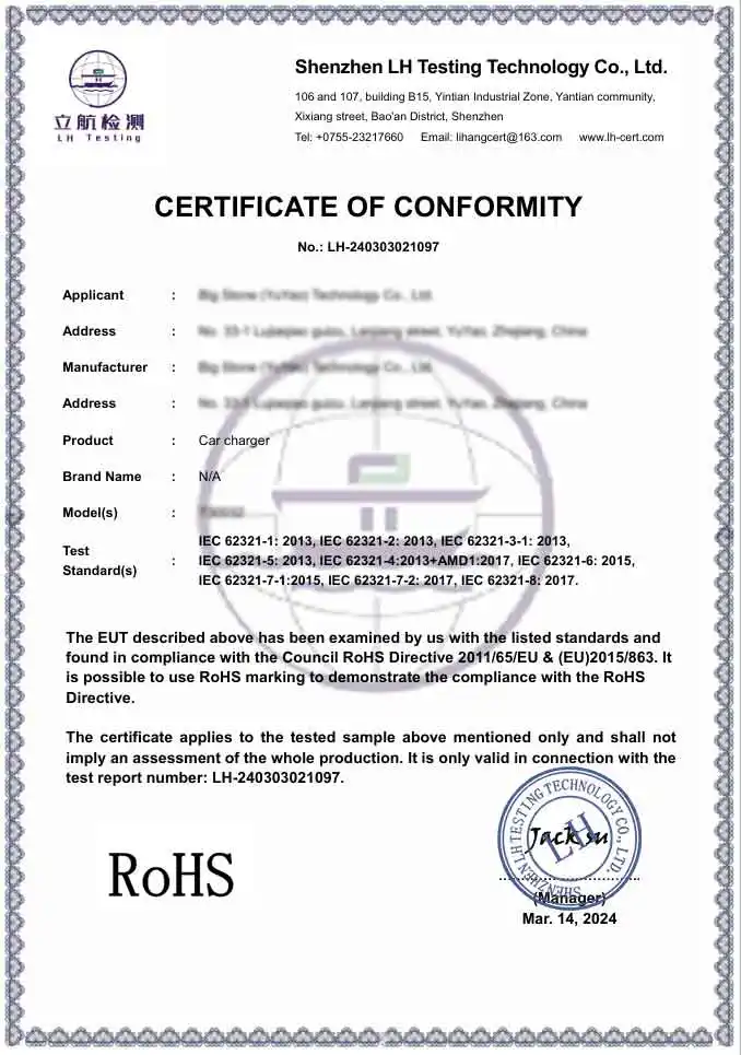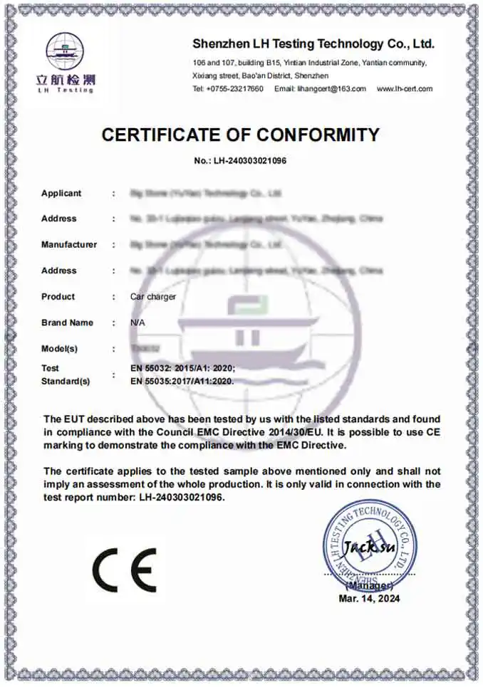 Α: Ως επαγγελματικό εργοστάσιο, τα προϊόντα μας συμμορφώνονται πλήρως με τα διεθνή πρότυπα ασφάλειας και περιβάλλοντος. Παρέχουμε προϊόντα με πιστοποίηση CE και RoHS. Επιπλέον, οι εγκαταστάσεις παραγωγής μας διαθέτουν πιστοποίηση BSCI και ISO, διασφαλίζοντας ότι οι προσαρμογείς φορτιστή αυτοκινήτου μας πληρούν τα αυστηρά τεχνικά και ηθικά πρότυπα που απαιτούνται από κορυφαίες παγκόσμιες μάρκες.